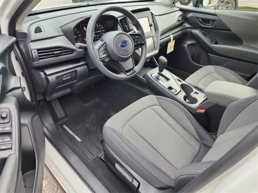 This 2025 Subaru Crosstrek in Crystal White Pearl, features Standard Model, 4 Speakers, 4-Wheel Disc Brakes, ABS brakes, Air Conditioning, All-Weather Floor Liners, Alloy wheels, AM/FM radio: SiriusXM, Anti-whiplash front head restraints, Auto High-beam Headlights, Automatic temperature control, Brake assist, Bumpers: body-color, Cloth Upholstery, Driver door bin, Driver vanity mirror, Dual front impact airbags, Dual front side impact airbags, Electronic Stability Control, Exterior Parking Camera Rear, Four wheel independent suspension, Front anti-roll bar, Front Bucket Seats, Front Center Armrest, Front dual zone A/C, Front reading lights, Fully automatic headlights, Illuminated entry, Knee airbag, Low tire pressure warning, Occupant sensing airbag, Outside temperature display, Overhead airbag, Overhead console, Panic alarm, Passenger door bin, Passenger vanity mirror, Power door mirrors, Power steering, Power windows, Radio data system, Radio: Subaru Dual 7.0 Multimedia System, Rear anti-roll bar, Rear window defroster, Rear window wiper, Remote keyless entry, Security system, Speed control, Speed-sensing steering, Split folding rear seat, Spoiler, Steering wheel mounted audio controls, Tachometer, Telescoping steering wheel, Tilt steering wheel, Traction control, Trip computer, Variably intermittent wipers, and Wheels: 17 x 7.0 J Dark Gray Aluminum-Alloy: AWD