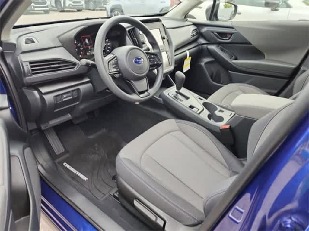 This 2025 Subaru Crosstrek in Sapphire Blue Pearl, features Standard Model, 4 Speakers, 4-Wheel Disc Brakes, ABS brakes, Air Conditioning, All-Weather Floor Liners, Alloy wheels, AM/FM radio: SiriusXM, Anti-whiplash front head restraints, Auto High-beam Headlights, Automatic temperature control, Brake assist, Bumpers: body-color, Cloth Upholstery, Driver door bin, Driver vanity mirror, Dual front impact airbags, Dual front side impact airbags, Electronic Stability Control, Exterior Parking Camera Rear, Four wheel independent suspension, Front anti-roll bar, Front Bucket Seats, Front Center Armrest, Front dual zone A/C, Front reading lights, Fully automatic headlights, Illuminated entry, Knee airbag, Low tire pressure warning, Occupant sensing airbag, Outside temperature display, Overhead airbag, Overhead console, Panic alarm, Passenger door bin, Passenger vanity mirror, Power door mirrors, Power steering, Power windows, Radio data system, Radio: Subaru Dual 7.0 Multimedia System, Rear anti-roll bar, Rear window defroster, Rear window wiper, Remote keyless entry, Security system, Speed control, Speed-sensing steering, Split folding rear seat, Spoiler, Steering wheel mounted audio controls, Tachometer, Telescoping steering wheel, Tilt steering wheel, Traction control, Trip computer, Variably intermittent wipers, and Wheels: 17 x 7.0 J Dark Gray Aluminum-Alloy: AWD