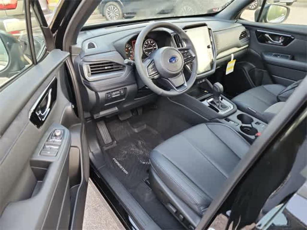 This 2025 Subaru Forester Limited in Crystal Black Silica, features harman/kardon Audio & Navigation & RAB (Radio: Subaru 11.6 Multimedia Navigation System and Reverse Automatic Braking (RAB) System), Protection Package (All-Weather Floor Liners, Cargo Tray, Rear Bumper Cover, and Splash Guards), 4-Wheel Disc Brakes, 6 Speakers, ABS brakes, Air Conditioning, Alloy wheels, AM/FM radio: SiriusXM with 360L, Anti-whiplash front head restraints, Auto High-beam Headlights, Auto-Dimming Exterior Mirror w/Approach Light, Auto-Dimming Mirror w/Compass & HomeLink, Automatic temperature control, Brake assist, Bumpers: body-color, Driver door bin, Driver vanity mirror, Dual front impact airbags, Dual front side impact airbags, Electronic Stability Control, Emergency communication system: MySubaru Safety (3-year free trial), Exterior Parking Camera Rear, Four wheel independent suspension, Front anti-roll bar, Front Bucket Seats, Front Center Armrest, Front dual zone A/C, Front fog lights, Front reading lights, Fully automatic headlights, Heated door mirrors, Heated Front Bucket Seats, Heated front seats, Heated steering wheel, Illuminated entry, Knee airbag, Leather steering wheel, LED Upgrade, Low tire pressure warning, Occupant sensing airbag, Outside temperature display, Overhead airbag, Overhead console, Panic alarm, Passenger door bin, Passenger vanity mirror, Perforated Leather-Trimmed Upholstery, Power door mirrors, Power driver seat, Power Liftgate, Power moonroof: Panoramic, Power passenger seat, Power steering, Power windows, Radio data system, Radio: Subaru 11.6 Multimedia Plus System, Rear anti-roll bar, Rear seat center armrest, Rear Seatback Protector, Rear window defroster, Rear window wiper, Remote keyless entry, Security system, Speed control, Speed-sensing steering, Split folding rear seat, Spoiler, Steering wheel mounted audio controls, Tachometer, Telescoping steering wheel, Tilt steering wheel, Traction control, Trip computer, Turn signal indicator mirrors, Variably intermittent wipers, and Wheels: 18 x 7.0 J Dark Metallic Aluminum-Alloy: Limited AWD
