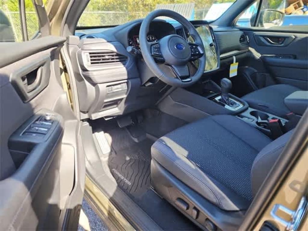 This 2025 Subaru Forester Premium in Autumn Green Metallic, features 4-Wheel Disc Brakes, 6 Speakers, ABS brakes, Air Conditioning, Alloy wheels, AM/FM radio: SiriusXM with 360L, Anti-whiplash front head restraints, Auto High-beam Headlights, Automatic temperature control, Brake assist, Bumpers: body-color, Driver door bin, Driver vanity mirror, Dual front impact airbags, Dual front side impact airbags, Electronic Stability Control, Emergency communication system: MySubaru Safety (3-year free trial), Exterior Parking Camera Rear, Four wheel independent suspension, Front anti-roll bar, Front Bucket Seats, Front Center Armrest, Front dual zone A/C, Front fog lights, Front reading lights, Fully automatic headlights, Heated door mirrors, Heated Front Bucket Seats, Heated front seats, Illuminated entry, Knee airbag, Leather steering wheel, Low tire pressure warning, Occupant sensing airbag, Outside temperature display, Overhead airbag, Overhead console, Panic alarm, Passenger door bin, Passenger vanity mirror, Power door mirrors, Power driver seat, Power moonroof: Panoramic, Power steering, Power windows, Premium Textured Cloth Upholstery, Radio data system, Radio: Subaru 11.6 Multimedia Plus System, Rear anti-roll bar, Rear seat center armrest, Rear window defroster, Rear window wiper, Remote keyless entry, Security system, Speed control, Speed-sensing steering, Split folding rear seat, Spoiler, Steering wheel mounted audio controls, Tachometer, Telescoping steering wheel, Tilt steering wheel, Traction control, Trip computer, Variably intermittent wipers, and Wheels: 17 x 7.0 J Dark Metallic Aluminum-Alloy: Premium AWD