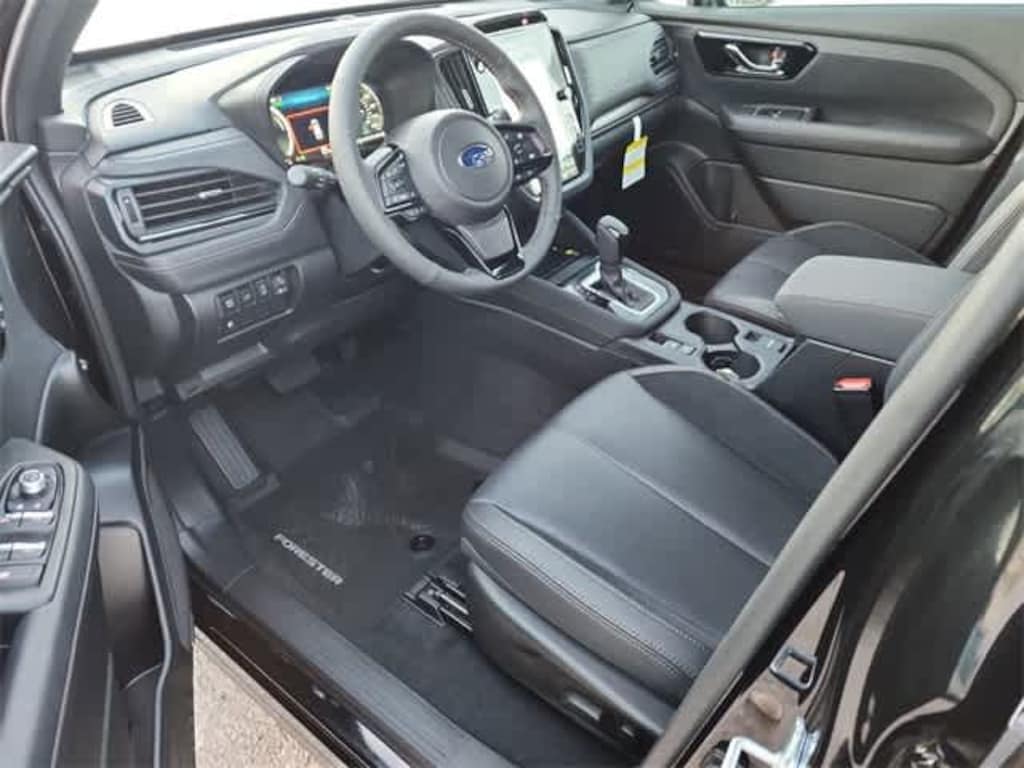 This 2025 Subaru Forester Hybrid Touring in Crystal Black Silica, features Standard Model, Touring Package (All-Weather Floor Liners, Auto-Dimming Exterior Mirror w/Approach Light, Body Side Molding - Crystal White Pearl, LED Upgrade, Rear Bumper Cover, and Splash Guards), 11 Speakers, 4-Wheel Disc Brakes, ABS brakes, Air Conditioning, Alloy wheels, AM/FM radio: SiriusXM with 360L, Anti-whiplash front head restraints, Auto High-beam Headlights, Automatic temperature control, Brake assist, Bumpers: body-color, Compass, Driver door bin, Driver vanity mirror, Dual front impact airbags, Dual front side impact airbags, Electronic Stability Control, Emergency communication system: MySubaru Safety (3-year free trial), Exterior Parking Camera Rear, Four wheel independent suspension, Front anti-roll bar, Front Bucket Seats, Front Center Armrest, Front dual zone A/C, Front fog lights, Front reading lights, Fully automatic headlights, harman/kardonî Speakers, Heated & Ventilated Front Bucket Seats, Heated door mirrors, Heated front seats, Heated rear seats, Heated steering wheel, HVAC memory, Illuminated entry, Knee airbag, Low tire pressure warning, Memory seat, Navigation system: TomTom Navigation w/what3words, Occupant sensing airbag, Outside temperature display, Overhead airbag, Overhead console, Panic alarm, Passenger door bin, Passenger vanity mirror, Perforated Leather-Trimmed Upholstery, Power door mirrors, Power driver seat, Power Liftgate, Power moonroof: Panoramic, Power passenger seat, Power steering, Power windows, Radio data system, Radio: Subaru 11.6 Multimedia Navigation System, Rear anti-roll bar, Rear seat center armrest, Rear Seatback Protector, Rear window defroster, Rear window wiper, Remote keyless entry, Security system, Speed control, Speed-sensing steering, Split folding rear seat, Spoiler, Steering wheel mounted audio controls, Tachometer, Telescoping steering wheel, Tilt steering wheel, Traction control, Trip computer, Turn signal indicator mirrors, Variably intermittent wipers, Ventilated front seats, and Wheels: 19 x 7.5 J Dark Gray Aluminum-Alloy: Touring AWD