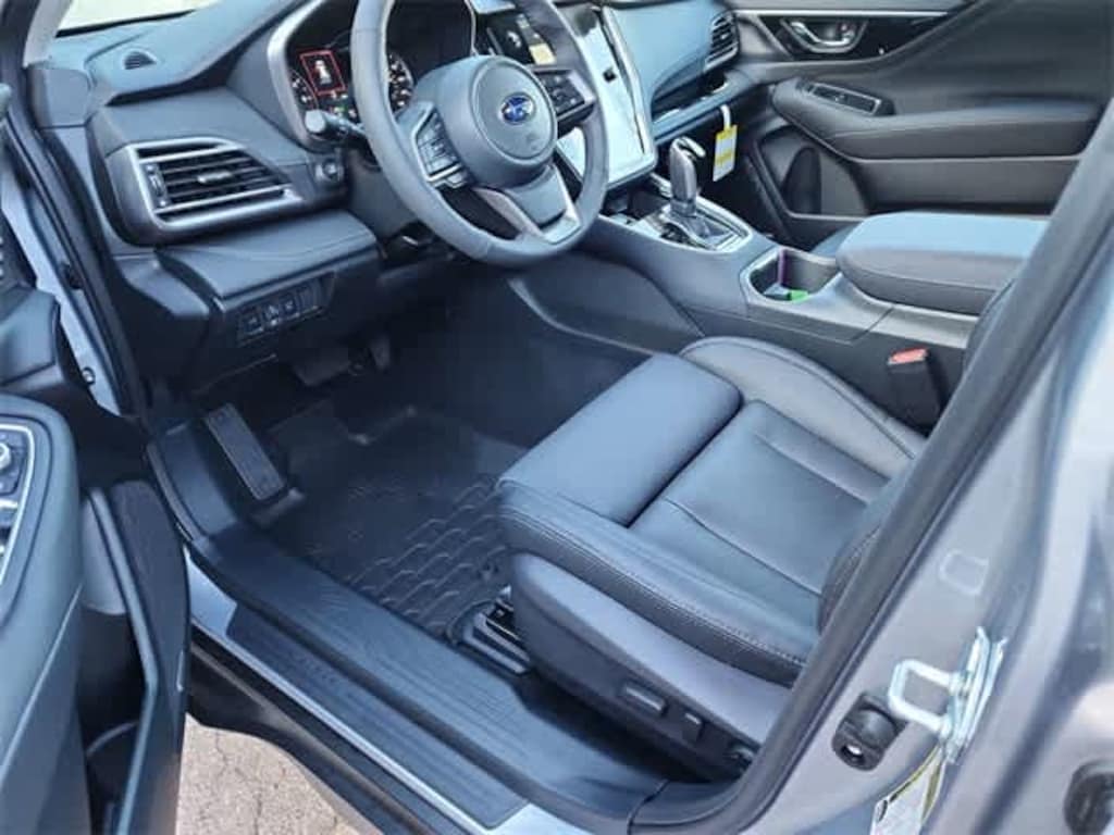 This 2025 Subaru Outback Touring in Ice Silver Metallic, features Popular Package #2 (All-Weather Floor Liners, Auto-Dimming Exterior Mirror w/Approach Light, LED Upgrade, Rear Bumper Cover, Rear Seat Back Protector, and Splash Guards), Standard Model, 12 Speakers, 4-Wheel Disc Brakes, ABS brakes, Air Conditioning, Alloy wheels, AM/FM radio: SiriusXM with 360L, Apple CarPlay & Android Auto, Auto High-beam Headlights, Auto-dimming Rear-View mirror, Automatic temperature control, Brake assist, Bumpers: body-color, Compass, Driver door bin, Driver vanity mirror, Dual front impact airbags, Dual front side impact airbags, Electronic Stability Control, Emergency communication system: MySubaru Safety (3-year free trial), Exterior Parking Camera Rear, Four wheel independent suspension, Front anti-roll bar, Front Bucket Seats, Front Center Armrest w/Storage, Front dual zone A/C, Front fog lights, Front reading lights, Fully automatic headlights, Garage door transmitter: HomeLink, harman/kardonî Speakers, Heated & Ventilated Front Bucket Seats, Heated door mirrors, Heated front seats, Heated rear seats, Heated steering wheel, HVAC memory, Illuminated entry, Knee airbag, Leather Shift Knob, Leather steering wheel, Low tire pressure warning, Memory seat, Navigation system: TomTom Navigation w/what3words, Occupant sensing airbag, Outside temperature display, Overhead airbag, Overhead console, Panic alarm, Passenger door bin, Passenger vanity mirror, Perforated Nappa Leather-Trimmed Upholstery, Power door mirrors, Power driver seat, Power Liftgate, Power moonroof, Power passenger seat, Power steering, Power windows, Radio: Subaru 11.6 Multimedia System w/Navigation, Rear anti-roll bar, Rear seat center armrest, Rear window defroster, Rear window wiper, Remote CD player, Remote keyless entry, Roof rack, Security system, Speed control, Speed-sensing steering, Split folding rear seat, Spoiler, Steering wheel mounted audio controls, Tachometer, Telescoping steering wheel, Tilt steering wheel, Traction control, Trip computer, Turn signal indicator mirrors, Variably intermittent wipers, Ventilated front seats, and Wheels: 18 x 7J Black Aluminum-Alloy: Touring AWD