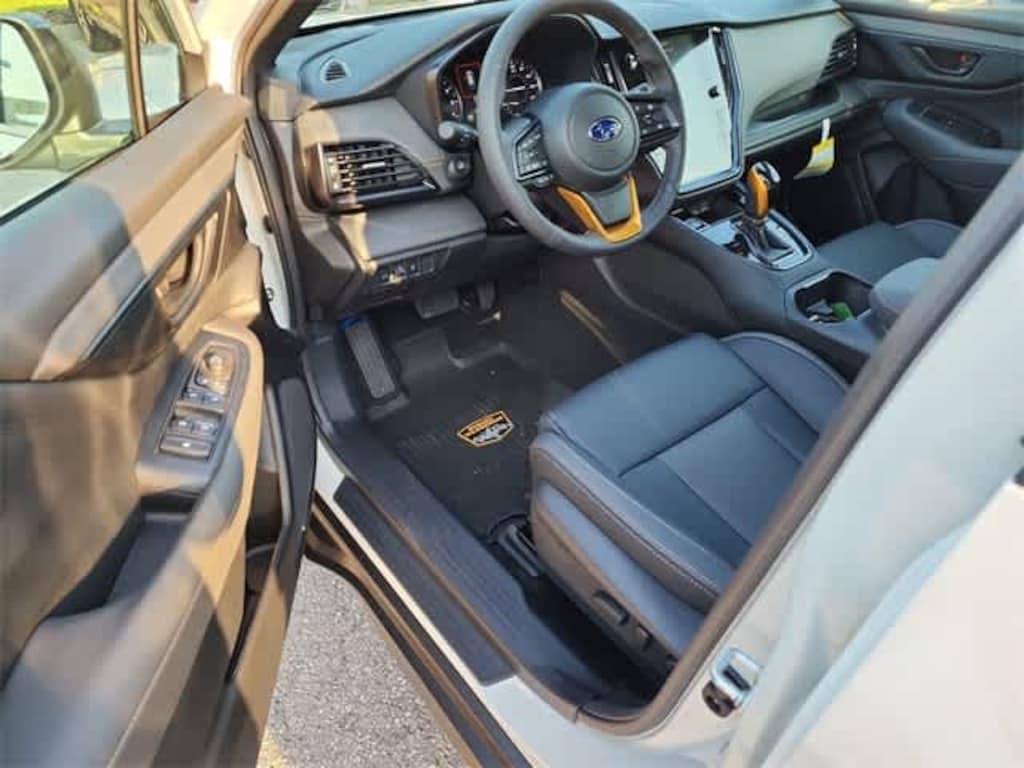 This 2025 Subaru Outback Wilderness in Crystal White Pearl, features Power Moonroof & Navigation & RAB (Power Moonroof, Radio: Subaru 11.6 Multimedia System w/Navigation, and Reverse Automatic Braking (RAB) System), Wilderness Package (Auto-Dimming Exterior Mirror w/Approach Light, Cargo Sidewall Protector, LED Upgrade, Rear Seat Back Protector, Splash Guards, and Wireless Charger), 12 Speakers, 4-Wheel Disc Brakes, ABS brakes, Air Conditioning, Alloy wheels, AM/FM radio: SiriusXM with 360L, Apple CarPlay & Android Auto, Auto High-beam Headlights, Auto-dimming Rear-View mirror, Automatic temperature control, Brake assist, Carpeted Floor Mats, Compass, Driver door bin, Driver vanity mirror, Dual front impact airbags, Dual front side impact airbags, Electronic Stability Control, Emergency communication system: MySubaru Safety (3-year free trial), Exterior Parking Camera Rear, Four wheel independent suspension, Front anti-roll bar, Front Bucket Seats, Front Center Armrest w/Storage, Front dual zone A/C, Front fog lights, Front reading lights, Fully automatic headlights, Garage door transmitter: HomeLink, harman/kardonî Speakers, Heated door mirrors, Heated Front Bucket Seats, Heated front seats, Heated rear seats, Heated steering wheel, Illuminated entry, Knee airbag, Leather steering wheel, Low tire pressure warning, Occupant sensing airbag, Outside temperature display, Overhead airbag, Overhead console, Panic alarm, Passenger door bin, Passenger vanity mirror, Power door mirrors, Power driver seat, Power Liftgate, Power passenger seat, Power steering, Power windows, Radio: Subaru 11.6 Multimedia Plus System, Rear anti-roll bar, Rear seat center armrest, Rear window defroster, Rear window wiper, Remote keyless entry, Roof rack, Security system, Speed control, Speed-sensing steering, Split folding rear seat, Spoiler, StarTex-Trimmed Upholstery, Steering wheel mounted audio controls, Tachometer, Telescoping steering wheel, Tilt steering wheel, Traction control, Trip computer, Turn signal indicator mirrors, Variably intermittent wipers, and Wheels: 17 x 7J Matte Black Aluminum-Alloy: Wilderness AWD