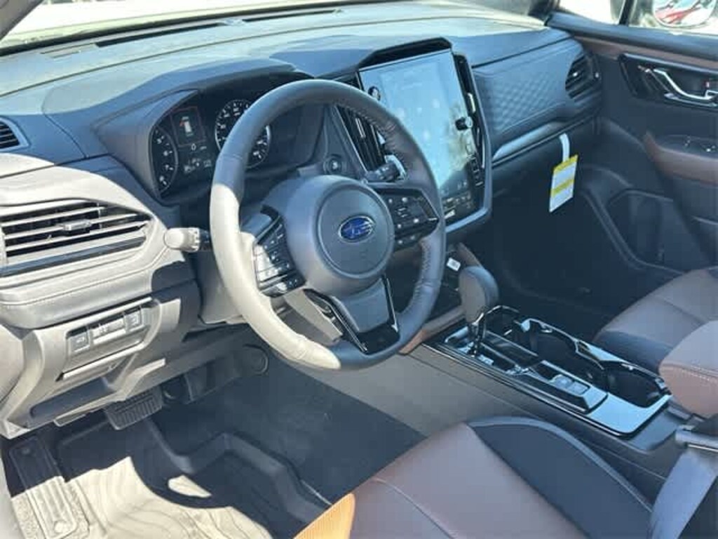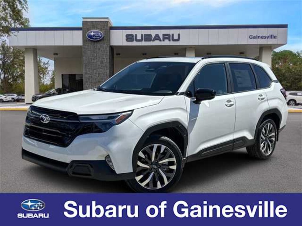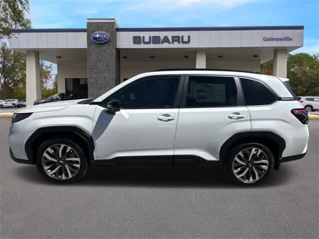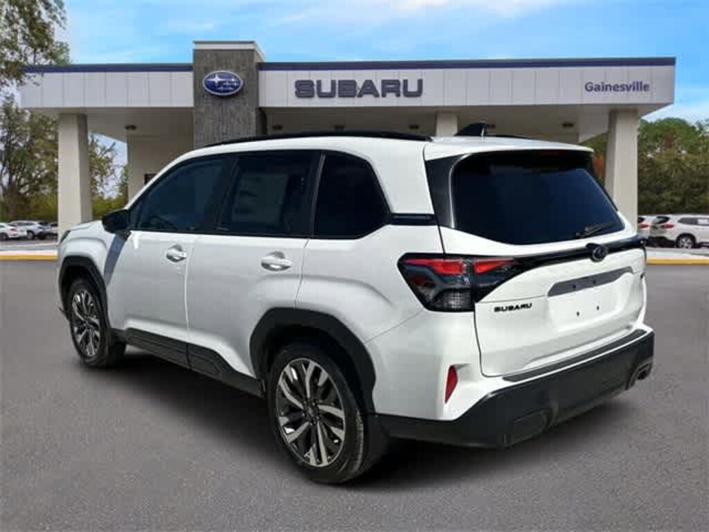 This 2026 Subaru Forester Touring in Crystal White Pearl, features Standard Model, 11 Speakers, 4-Wheel Disc Brakes, ABS brakes, Air Conditioning, All-Weather Floor Liners, Alloy wheels, AM/FM radio: SiriusXM with 360L, Anti-whiplash front head restraints, Auto High-beam Headlights, Auto-Dimming Exterior Mirror with Approach Light, Automatic temperature control, Brake assist, Bumpers: body-color, Cargo Net, Driver door bin, Driver vanity mirror, Dual front impact airbags, Dual front side impact airbags, Electronic Stability Control, Emergency communication system: MySubaru Companion (5-years free), Exterior Parking Camera Rear, Four wheel independent suspension, Front anti-roll bar, Front Bucket Seats, Front Center Armrest, Front dual zone A/C, Front fog lights, Front reading lights, Fully automatic headlights, harman/kardonî Speakers, Heads-Up Display, Heated and Ventilated Front Bucket Seats, Heated door mirrors, Heated front seats, Heated rear seats, Heated steering wheel, HVAC memory, Illuminated entry, Knee airbag, Leather Shift Knob, Leather steering wheel, Low tire pressure warning, Memory seat, Navigation System, Occupant sensing airbag, Outside temperature display, Overhead airbag, Overhead console, Panic alarm, Passenger door bin, Passenger vanity mirror, Perforated Leather-Trimmed Upholstery, Power door mirrors, Power driver seat, Power Liftgate, Power moonroof: Panoramic, Power passenger seat, Power steering, Power windows, Radio data system, Radio: Subaru 11.6 Multimedia Navigation System, Rain sensing wipers, Rear anti-roll bar, Rear Bumper Cover, Rear seat center armrest, Rear window defroster, Rear window wiper, Remote keyless entry, Security system, Speed control, Speed-sensing steering, Splash Guards, Split folding rear seat, Spoiler, Steering wheel mounted audio controls, Tachometer, Telescoping steering wheel, Tilt steering wheel, Traction control, Trip computer, Turn signal indicator mirrors, Variably intermittent wipers, Ventilated front seats, and Wheels: 19 x 7.5 J Dark Gray Aluminum-Alloy: Touring AWD