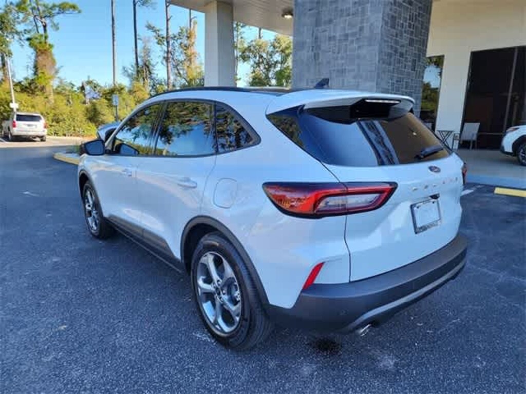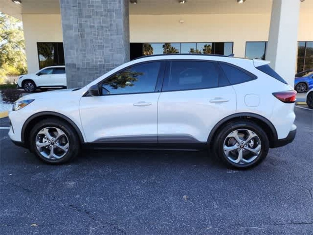 This 2025 Ford Escape ST-Line in Space Silver Metallic, features Tech Pack #1 (Adaptive Cruise Control w/Stop-and-Go, Connected Navigation, Ford Co-Pilot360 Assist+, Intersection Assist, Predictive Speed Assist, Rear Parking Sensor, Rear-View Camera, and SYNC 4 w/Enhanced Voice Recognition), Equipment Group 300A, Black Roof-Rack Side Rails, Panoramic Vista Roof, 3.81 Axle Ratio, 4-Wheel Disc Brakes, 6 Speakers, ABS brakes, Air Conditioning, Alloy wheels, AM/FM radio: SiriusXM, AM/FM Stereo, Auto High-beam Headlights, Automatic temperature control, Brake assist, Bumpers: body-color, Compass, Delay-off headlights, Driver door bin, Driver vanity mirror, Dual front impact airbags, Dual front side impact airbags, Electronic Stability Control, Emergency communication system: SYNC 4 911 Assist, FordPass Connect, Four wheel independent suspension, Front anti-roll bar, Front Bucket Seats, Front Center Armrest, Front dual zone A/C, Front reading lights, Fully automatic headlights, Illuminated entry, Knee airbag, Low tire pressure warning, Occupant sensing airbag, Outside temperature display, Overhead airbag, Overhead console, Panic alarm, Passenger door bin, Passenger vanity mirror, Power door mirrors, Power driver seat, Power Liftgate, Power steering, Power windows, Radio data system, Rear anti-roll bar, Rear reading lights, Rear seat center armrest, Rear window defroster, Rear window wiper, Remote keyless entry, Speed control, Speed-sensing steering, Speed-Sensitive Wipers, Split folding rear seat, Spoiler, Sport steering wheel, Steering wheel mounted audio controls, SYNC 4, Tachometer, Telescoping steering wheel, Tilt steering wheel, Traction control, Trip computer, Variably intermittent wipers, Vinyl/Cloth Front Sport Contour Bucket Seats, and Wheels: 18 Rock Metallic Painted Aluminum: BLUETOOTH HANDS FREE, BACK-UP CAMERA, POWER PACKAGE, Adaptive Cruise Control w/Stop-and-Go, Black Roof-Rack Side Rails, Connected Navigation, Ford Co-Pilot360 Assist+, Intersection Assist, Panoramic Vista Roof, Predictive Speed Assist, Rear Parking Sensor, Rear-View Camera, SYNC 4 w/Enhanced Voice Recognition, Tech Pack #1.