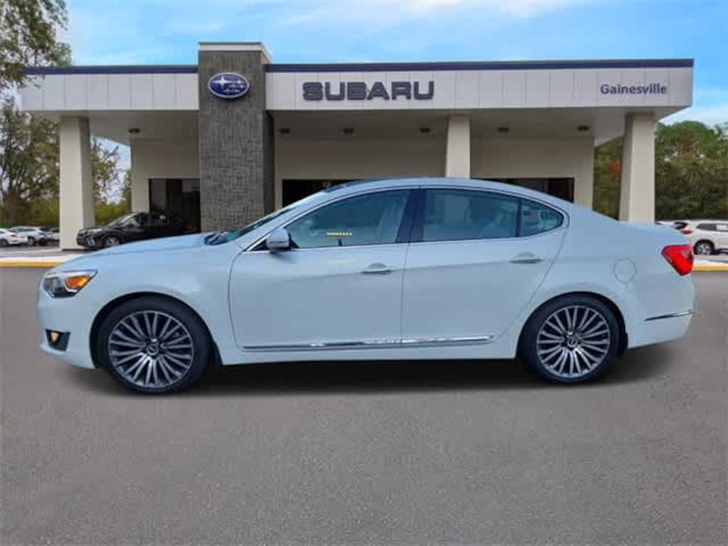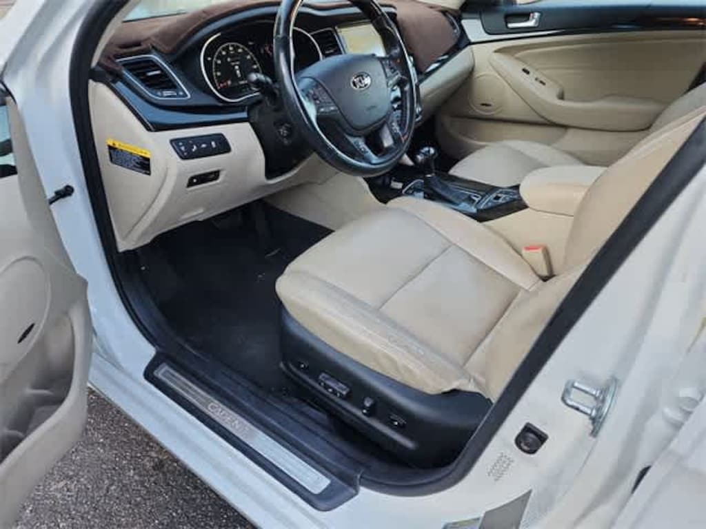 This 2016 Kia Cadenza Premium in Snow White Pearl, features Luxury Plus Package (7 TFT LCD Meter Cluster & Information Display, Blind Spot Detection, Drivers Seat Cushion Extension, First Aid Kit, Heated Rear Outboard Seats, Heated Steering Wheel, HID Headlamps w/Dynamic Bending Light, Memory Drivers Seat & Outside Mirrors, Power Rear Sunshade, Power Tilt & Telescoping Steering Column, Premium Nappa Leather Seat Trim, Rear Cross Traffic Alert (RCTA), Ventilated Front Seats, and Wiper Deicer), Technology Package (19 x 8.5 Alloy Wheels, Advanced Smart Cruise Control, Electronic Parking Brake, Hydrophobic Water Repelling Front Side Windows, and Lane Departure Warning System), 12 Speakers, 18 x 7.5 Alloy Wheels, 4-Wheel Disc Brakes, ABS brakes, Air Conditioning, Alloy wheels, AM/FM radio: SiriusXM, Auto-dimming Rear-View mirror, Automatic temperature control, Bodyside moldings, Brake assist, Bumpers: body-color, Cargo Net, CD player, Compass, Delay-off headlights, Driver door bin, Driver vanity mirror, Dual front impact airbags, Dual front side impact airbags, Electronic Stability Control, Exterior Parking Camera Rear, Four wheel independent suspension, Front anti-roll bar, Front Bucket Seats, Front Center Armrest, Front dual zone A/C, Front fog lights, Front reading lights, Fully automatic headlights, Garage door transmitter: HomeLink, Heated door mirrors, Heated Front Bucket Seats, Heated front seats, Illuminated entry, Leather Seat Trim, Leather steering wheel, Low tire pressure warning, Navigation System, Occupant sensing airbag, Outside temperature display, Overhead airbag, Overhead console, Panic alarm, Passenger door bin, Passenger vanity mirror, Power door mirrors, Power driver seat, Power moonroof, Power passenger seat, Power steering, Power windows, Radio data system, Radio: INFINITI Audio System w/AM/FM/CD/MP3/NAV, Rain sensing wipers, Rear anti-roll bar, Rear Parking Sensors, Rear reading lights, Rear seat center armrest, Rear side impact airbag, Rear window defroster, Remote keyless entry, Security system, Speed control, Speed-sensing steering, Steering wheel mounted audio controls, Tachometer, Telescoping steering wheel, Tilt steering wheel, Traction control, Trip computer, Turn signal indicator mirrors, and Variably intermittent wipers: BLUETOOTH HANDS FREE, BACK-UP CAMERA, LEATHER, POWER SEATS, POWER PACKAGE, ALLOY WHEELS.