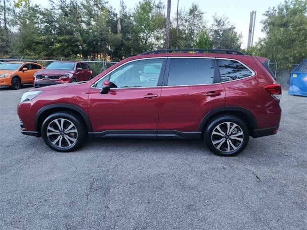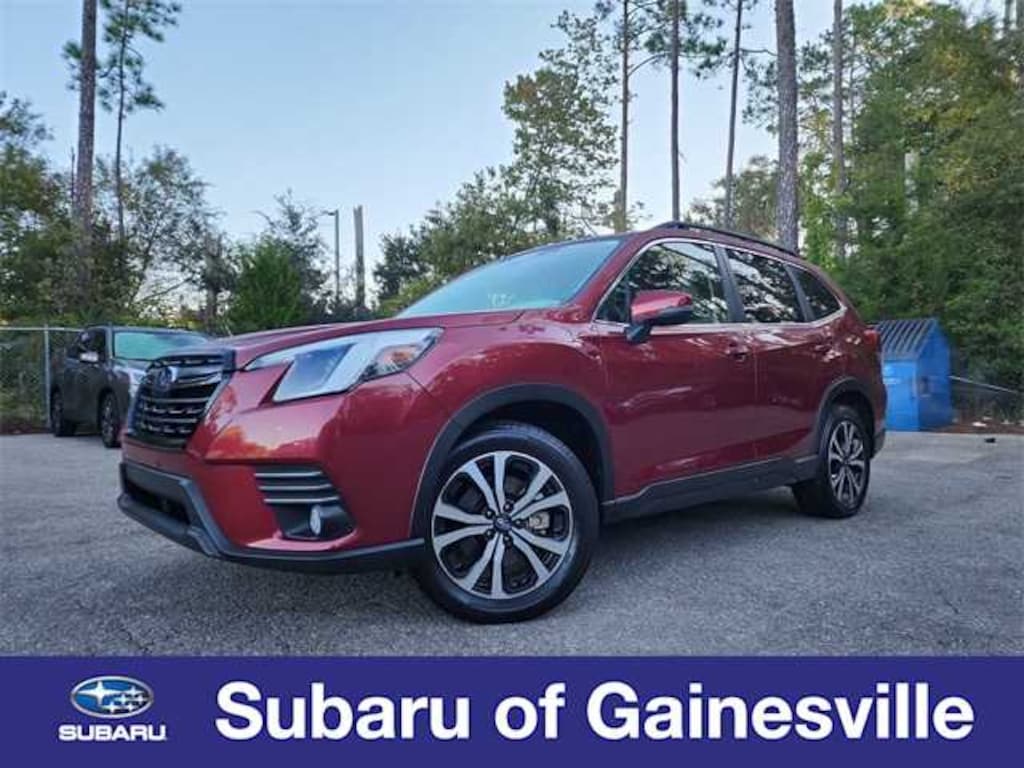 This 2022 Subaru Forester Limited in Crimson Red Pearl, features Standard Model, 3.70 Axle Ratio, 4-Wheel Disc Brakes, 6 Speakers, ABS brakes, Air Conditioning, All-Weather Floor Liners, Alloy wheels, AM/FM radio: SiriusXM, Anti-whiplash front head restraints, Auto High-beam Headlights, Automatic temperature control, Brake assist, Bumpers: body-color, CD player, Driver door bin, Driver vanity mirror, Dual front impact airbags, Dual front side impact airbags, Electronic Stability Control, Emergency communication system: STARLINK Safety and Security (Subscription Required), Exterior Parking Camera Rear, Four wheel independent suspension, Front anti-roll bar, Front Bucket Seats, Front Center Armrest, Front dual zone A/C, Front fog lights, Front reading lights, Fully automatic headlights, Heated door mirrors, Heated Front Bucket Seats, Heated front seats, Illuminated entry, Knee airbag, Leather Shift Knob, Low tire pressure warning, Occupant sensing airbag, Outside temperature display, Overhead airbag, Overhead console, Panic alarm, Passenger door bin, Passenger vanity mirror, Perforated Leather-Trimmed Upholstery, Power door mirrors, Power driver seat, Power Liftgate, Power moonroof: Panoramic, Power steering, Power windows, Radio data system, Radio: Subaru Starlink 8.0 Multimedia Plus System, Rear anti-roll bar, Rear seat center armrest, Rear window defroster, Rear window wiper, Remote keyless entry, Roof rack: rails only, Security system, Speed control, Speed-sensing steering, Split folding rear seat, Spoiler, STARLINK/Apple CarPlay/Android Auto, Steering wheel mounted audio controls, Tachometer, Telescoping steering wheel, Tilt steering wheel, Traction control, Trip computer, Turn signal indicator mirrors, Variably intermittent wipers, and Wheels: 18 x 7.0J Black Machine Finish Alum Alloy: Subaru Certified, BLUETOOTH HANDS FREE, BACK-UP CAMERA, APPLE CAR PLAY, LEATHER, SUNROOF, HEATED SEATS, POWER SEATS, POWER PACKAGE, ALLOY WHEELS, ONE OWNER NEVER A RENTAL, CLEAN VEHICLE HISTORY. Certified. Subaru Certified Pre-Owned Details: