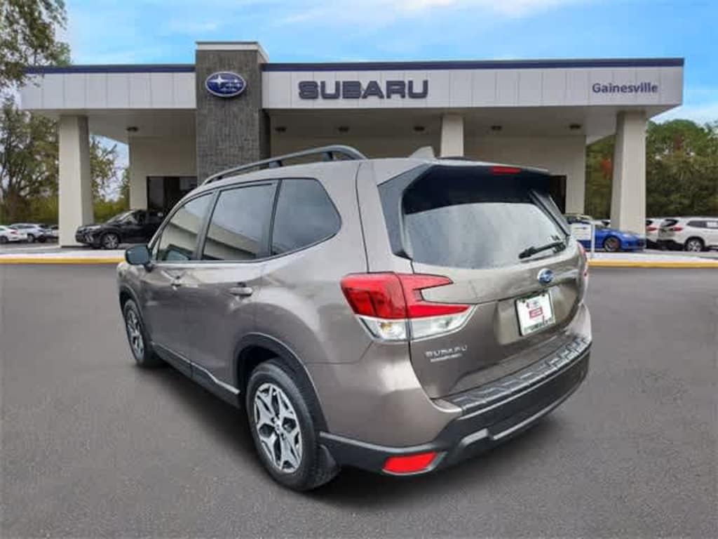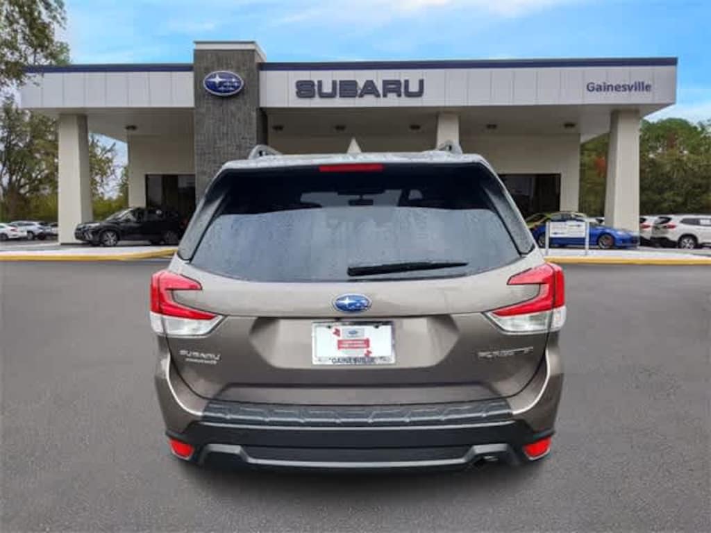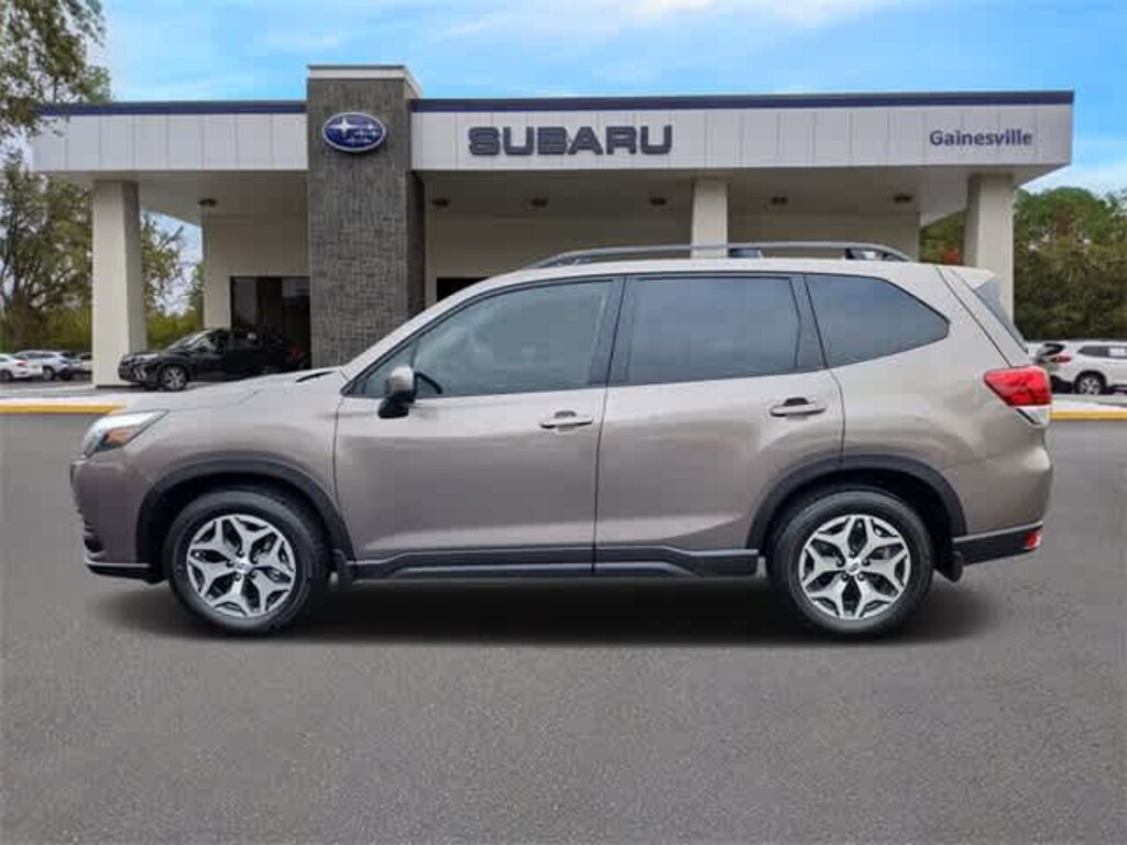 This 2023 Subaru Forester Premium in Brilliant Bronze Metallic, features Blind Spot Detection w/RCTA & Power Rear Gate (Blind-Spot Detection (BSD), Drivers Seatback Divided Pocket, Dual USB Charge Ports, EyeSight System, Multi-Function High Grade Display, and Power Rear Gate), 3.70 Axle Ratio, 4-Wheel Disc Brakes, 6 Speakers, ABS brakes, Air Conditioning, Alloy wheels, AM/FM radio: SiriusXM, Anti-whiplash front head restraints, Auto High-beam Headlights, Auto-Dimming Mirror w/Compass & HomeLink, Automatic temperature control, Brake assist, Bumpers: body-color, CD player, Driver door bin, Driver vanity mirror, Dual front impact airbags, Dual front side impact airbags, Electronic Stability Control, Emergency communication system: STARLINK Safety and Security (Subscription Required), Exterior Parking Camera Rear, Four wheel independent suspension, Front anti-roll bar, Front Bucket Seats, Front Center Armrest, Front fog lights, Front reading lights, Fully automatic headlights, Heated door mirrors, Heated Front Bucket Seats, Heated front seats, Illuminated entry, Knee airbag, Low tire pressure warning, Occupant sensing airbag, Outside temperature display, Overhead airbag, Overhead console, Panic alarm, Passenger door bin, Passenger vanity mirror, Power door mirrors, Power driver seat, Power moonroof: Panoramic, Power steering, Power windows, Premium Cloth Upholstery, Radio data system, Radio: Subaru Starlink 6.5 Multimedia Plus System, Rear anti-roll bar, Rear seat center armrest, Rear window defroster, Rear window wiper, Remote keyless entry, Roof rack: rails only, Security system, Speed control, Speed-sensing steering, Split folding rear seat, Spoiler, STARLINK/Apple CarPlay/Android Auto, Steering wheel mounted audio controls, Tachometer, Telescoping steering wheel, Tilt steering wheel, Traction control, Trip computer, Variably intermittent wipers, and Wheels: 17 x 7.0 J Black Machine Finish Alloy: Subaru Certified, BLUETOOTH HANDS FREE, BACK-UP CAMERA, APPLE CAR PLAY, SUNROOF, HEATED SEATS, POWER PACKAGE, ALLOY WHEELS, ONE OWNER NEVER A RENTAL, CLEAN VEHICLE HISTORY. Certified. Subaru Certified Pre-Owned Details: